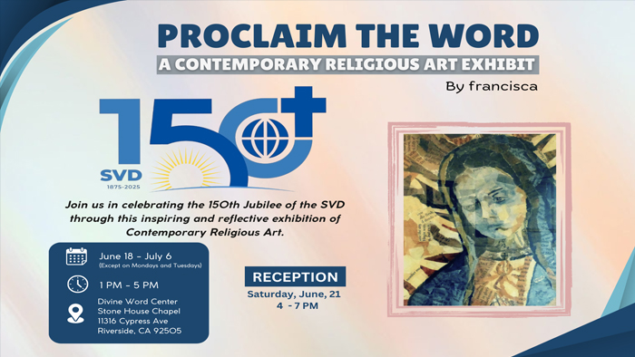 This year Divine Word Missionaries are celebrating the 150th Anniversary of our founding. We are sponsoring a Contemporary Religious Art Exhibit. by francisca. We invite you and your Wordnet Community to visit sometime between June 18 and July 6th at Divine Word Retreat Center in Riverside.